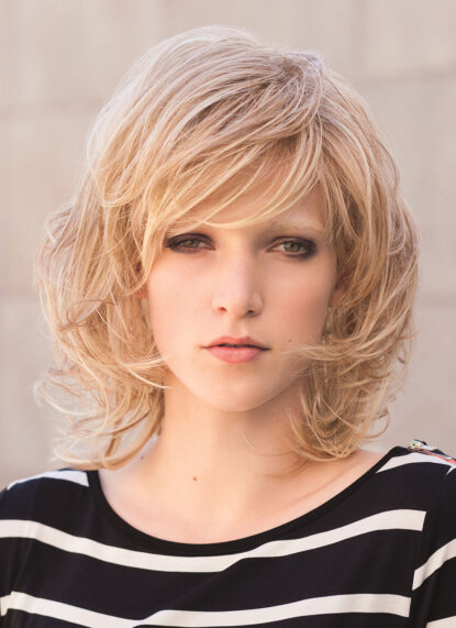 Feminin und mit einer sportlichen Eleganz versehen – das ist die Kunsthaarperücke Celebrity von Gisela Mayer. Die Mittellanghaarfrisur aus der Modern Hair Kollektion besticht durch fransige Wellen, stufig geschnittenes Kunsthaar und atemberaubendes Volumen, weshalb Sie sich besonders gut für junge Frauen mit ovalen, herzförmigen und auch länglichen Gesichtsformen eignet. Sie kann in der Standardgröße (54-56cm) erworben werden und ist äußerst leicht zu pflegen, da sie aus Kunsthaar besteht. Nachdem Sie die Kunsthaarperücke gewaschen haben, müssen Sie diese nur an der Luft trocknen lassen. Sobald sie trocken ist, fällt sie von allein – ohne ein erforderliches Styling – in ihre Ausgangsform zurück. Sie können sich über ein langanhaltendes intensives Farbergebnis freuen, auch die gewellte Struktur bleibt erhalten und verliert nicht ihre Leichtigkeit, wenn Sie die Perücke vor einer Hitzebehandlung schützen. Die Montur dieser Perücke weist eine besondere Herstellungsart auf, da es mit einem Teil-Monofilament verarbeitet wurde. Das bedeutet, dass das Modell im Vergleich zu einer reinen Tressenperücke deshalb noch authentischer wirkt. Optisch ähnelt diese Partie der menschlichen Kopfhaut sehr, da diese auch durch den feinen Stoff durchscheint. Besonders gut ist dies an der Scheitelstelle zu sehen, da die Frisur am Bereich des Oberkopfes flach anliegt und hier ein Blick auf die Kopfhaut ermöglicht wird. Das exklusive Kunsthaar ist als solches einzeln und manuell auf ein Mono-Netz eingeknüpft worden. Ansonsten ist die Kunsthaarperücke Celebrity komplett tressiert. Das bedeutet, dass das mittellange Haar maschinell auf Baumwollbänder genäht wurde, die man auch als Tressen bezeichnet. Hierdurch gewinnt die Frisur ihr natürlich wirkendes Volumen. Insgesamt besticht die Markenperücke durch leichte und atmungsaktive Materialien. Sie bietet Ihnen somit ultimativen Tragekomfort, der dadurch verstärkt wird, dass Sie mit einem verstellbaren elastischen Band den Umfang der Perücke nach Belieben im vorgegebenen Rahmen anpassen können. Die Modern Hair Kollektion hat mit der Celebrity ein Modell im Angebot, das durch die Knüpftechnik besonders natürlich aussieht. Zeigen Sie anderen Ihre aufregende und dynamische Seite – ob im Alltag oder zu besonderen Anlässen!