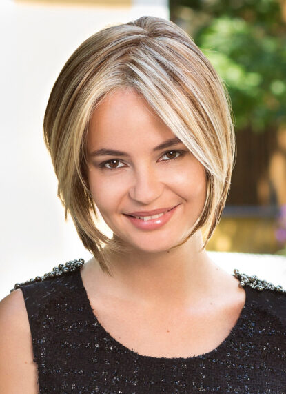 Cindy Mono Lace, die schicke Mittellanghaarfrisur aus Kunsthaar, die echtem Haar zum Verwechseln ähnlich sieht!Das Modell von Gisela Mayer aus der Modern Hair Kollektion wird Ihnen aufgrund seines authentischen Volumens am Oberkopf sowie dem angenehmen Tragekomfort gefallen. Durch den sanften Stufenschnitt eignet es sich besonders für ovale und herzförmige Gesichtsformen. Die Verbindung der Monturen aus Monofilament und Tresse gewährt neben einem hervorragenden Tragekomfort einen sehr natürlichen Look. So wurde jedes einzelne Kunsthaar per Hand auf den gesamten Bereich des Oberkopfes, der aus dem Monofilament-Gewebe charakterisiert ist, eingeknüpft. Das verwendete Material ist sehr dünn und leicht und zudem atmungsaktiv. Daneben ahmt das Monofilament die menschliche Kopfhaut verblüffend echt nach und lässt sie auch bedingt durchschimmern. Der Hinterkopf und die Seiten sind wiederum komplett tressiert. Das Kunsthaar wird also maschinell auf Baumwollbänder aufgenäht, die Tressen genannt werden, und darüber hinaus über eine luftdurchlässige Eigenschaft verfügen. Der Filmansatz, der auch als Lace-Front bekannt ist, macht es außerdem möglich, die Frisur auch stirnfrei zu tragen und somit im Look zu variieren. Darüber hinaus können Sie mit einem verstellbaren elastischen Band den Umfang der Perücke je nach Tragegefühl anpassen und so eigenständig sicherstellen, dass die Perücke nicht verrutscht und gut sitzt. Erwerben Sie die Cindy Mono Lace in der verfügbaren Standardgröße (54-56cm) und lassen Sie sich nicht zuletzt durch die einfache Pflege begeistern. Denn nach dem Waschen muss die Perücke von Gisela Mayer nur an der Luft trocknen. Sie findet im trockenen Zustand von selbst in ihre Form zurück und trotz mehrmaligem Tragen und Waschen wird sie Sie mit Glanz und Farbintensität überzeugen! Freuen Sie sich bei idealer Pflege über eine lange Tragedauer, bei der die Perücke nicht an Qualität einbüßt.