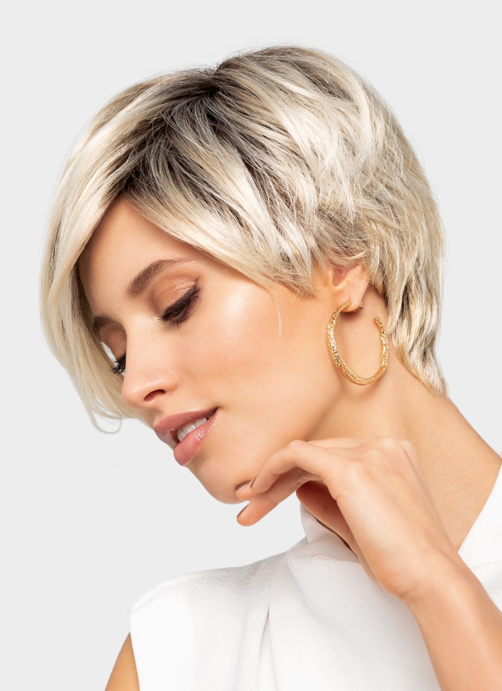 Die Gisela Mayer Perücke Hi Click aus der Next Generation Collection ist eine hochwertige Damenperücke, die aus formbarem Kunsthaar hergestellt wurde. Das flexible High Heat Kunsthaar ermöglicht es Ihnen, Ihren Look immer wieder neu zu entdecken und bietet zahlreiche Stylingmöglichkeiten. Mit dieser Perücke können Sie eine glamouröse Kurzhaarfrisur mit leichten Stufen für mehr Volumen tragen. Die feminine Frisur eignet sich perfekt für alle Anlässe und verfügt über eine länger gehaltene Ponypartie. Sie können die Frisur ganz nach Ihren Wünschen anpassen. Dieses Modell kann geföhnt und mit einem Glätteisen bis