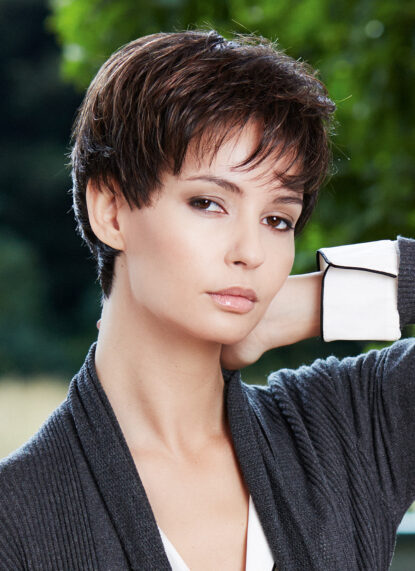 Locker, lässig und trotzdem elegant kommt diese wunderschöne Kurzhaarfrisur von Gisela Mayer daher! Die leicht durchgestuften, kurzen Haare der Kunsthaarperücke Lizzy Mono verleihen Ihnen einen femininen, natürlichen Look. Dieser wird durch den frechen Fransenpony abgerundet, der so gekonnt in die Stirn fällt, das der Rand der Damenperücke aus der Modern Hair Collection nicht zu sehen ist! Sie erhalten dieses Modell in der Standardgröße für einen Kopfumfang von 54-56 cm. Dank der Verarbeitung eines flexiblen Tressen-Gewebes und einen transparenten Monofilaments erhalten Sie sowohl eine ausgesprochen natürliche Optik als auch einen hohen Tragekomfort. Die luftig leichten Baumwolltressen enthalten zu einem Teil ein Stretch-Gewebe, wodurch sie sich angenehm und sicher an Ihren Kopf anschmiegen. Durch den feinen Filament-Stoff am Oberkopf schimmert die menschliche Haut durch. Im Kombination mit der manuellen Knüpfung des glänzenden Kunsthaares sieht es so aus, als würden die Haare echt aus der Kopfhaut wachsen!